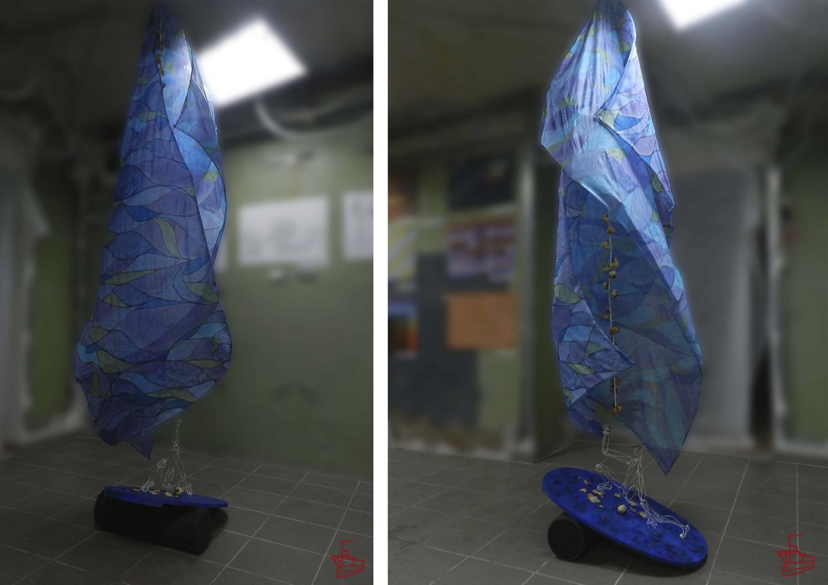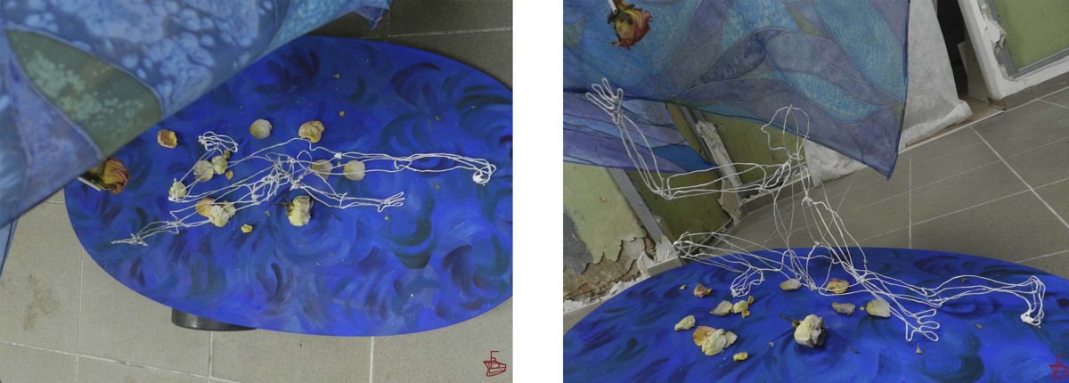 Эта работа показывает жизнь человека. Как он балансирует в "житейские море", пытаясь хвататься за соломинку, прекрасную и нежную, но возможно предательски колкую. При этом житейские проблемы и заботы наступают на него вихрем и с верху. Синие цвета под ногами и над головой героя инсталляции отсылают к тому, что справиться с этими надвигающими вихрями и неустойчивой, уходящей из-под ног, земли можно только с помощью самоконтроля, спокойствия, которые в свою очередь подпитывается из окружающего мира. Ведь если всмотреться в вихри, то можно увидеть там маленькие проблески белого цвета, и они повсюду. Надо только обратить на это внимание.