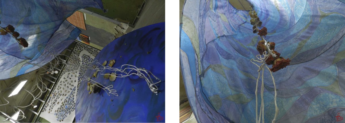 Материалы: холодный батик на шелке, провод, высушенные цветы, проволока, балансборд, темпера.