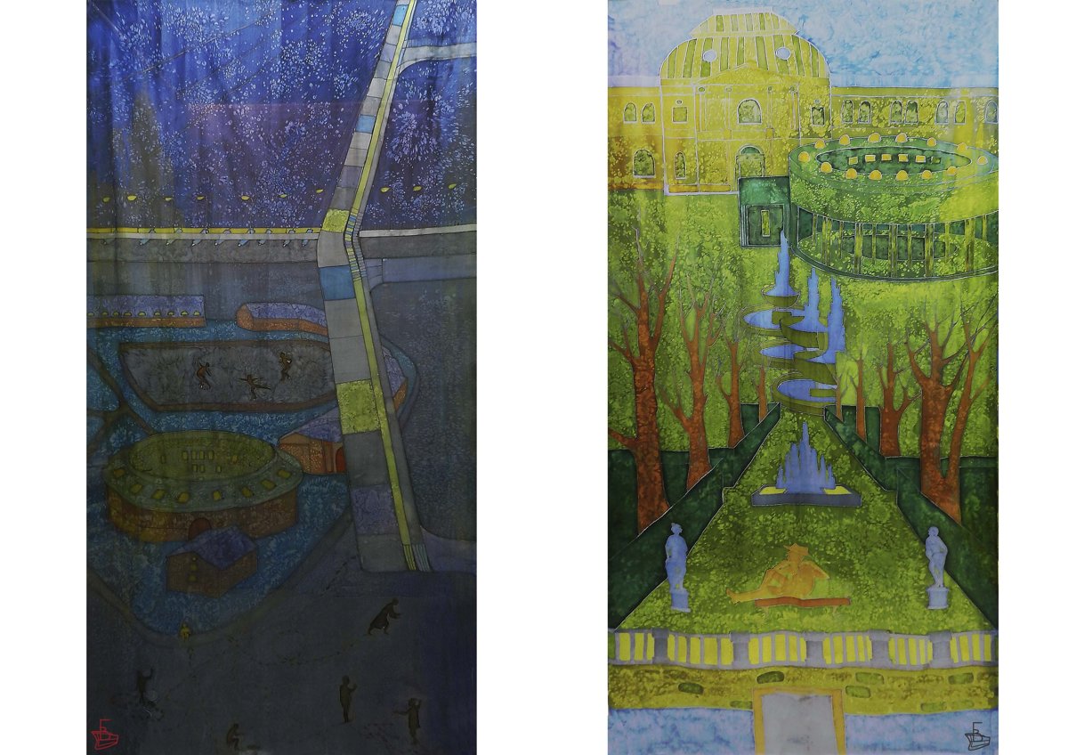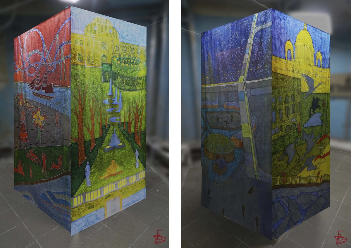 4 росписи, каждая из которых символизирует свое время года и изображает запомнившиеся лично мне больше всего их моменты за время, проведенное в Питере. То, что ассоциируется и сразу всплывает в памяти. Из этих воспоминаний в нашей голове будто плетется ткань.