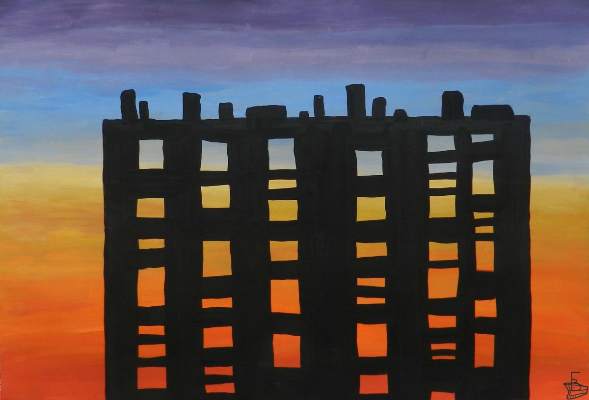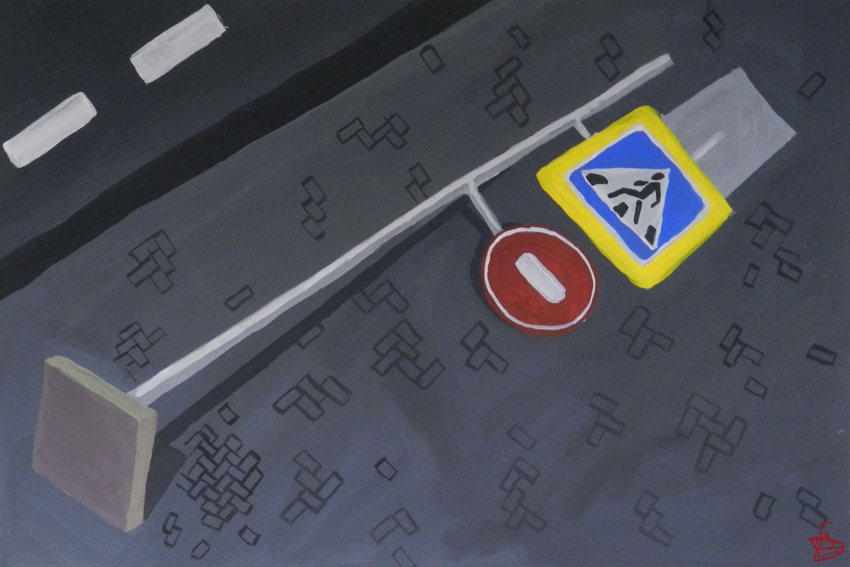 Первая работа этой серии "Путь" изображает панораму пути из Москвы в Питер. Она символизирует сложный жизненный путь, в котором есть взлеты и падения, что показано с помощью выразительного силуэта. Выполнена в технике трафаретной печати.