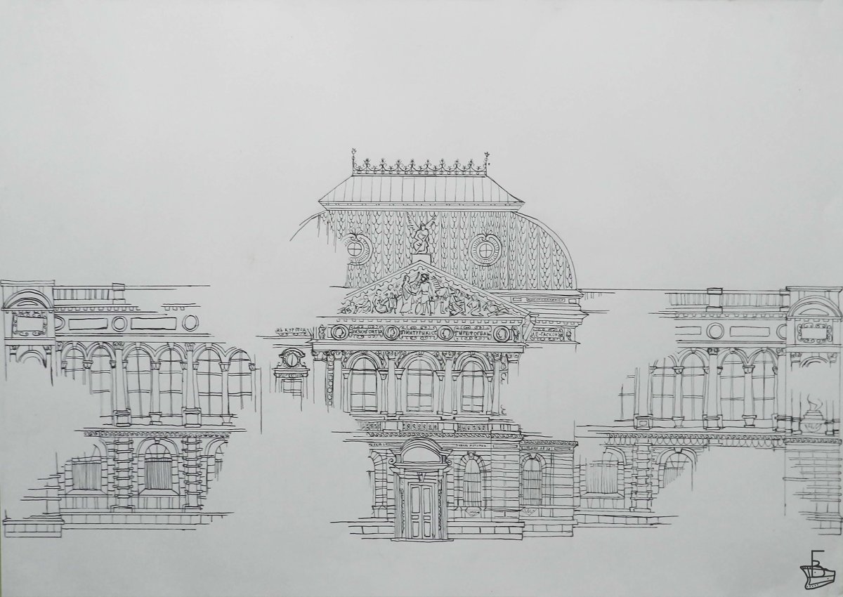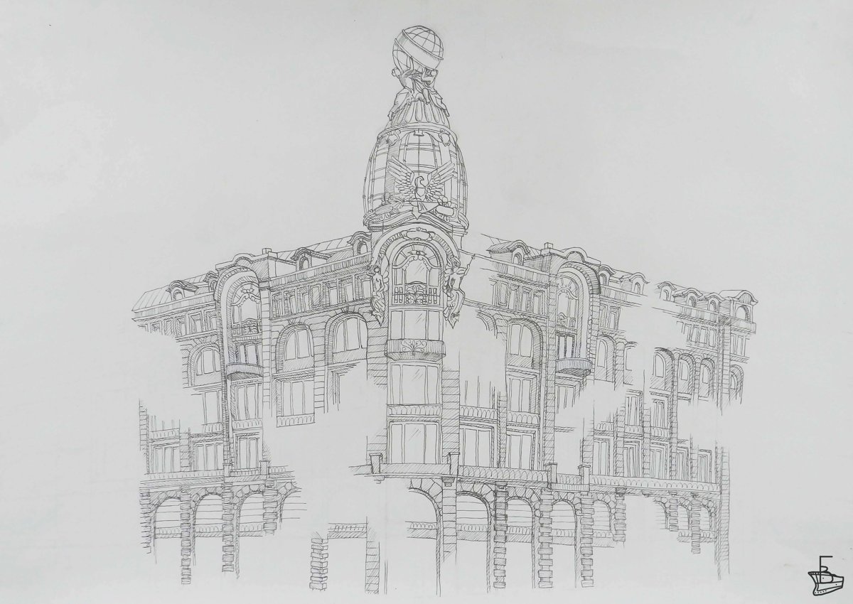 Это один из самых красивейших зданий Невского проспекта. На его примере, прорисовав его не полностью, я хотела показать тип восприятия окружающего мира. Ведь иногда мы будто видим не полную картинку. Не осознаем общей картины и ее красоты.