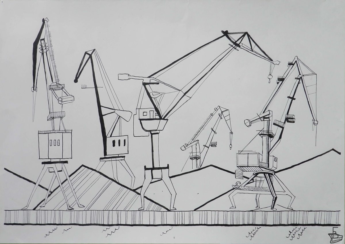 Портовые краны знакомы всем еще с детства. Из воспринимают как просто утилитарную вещь. Но она еще и красива. Из нити и линии могут заставить остановиться, чтобы понаблюдать